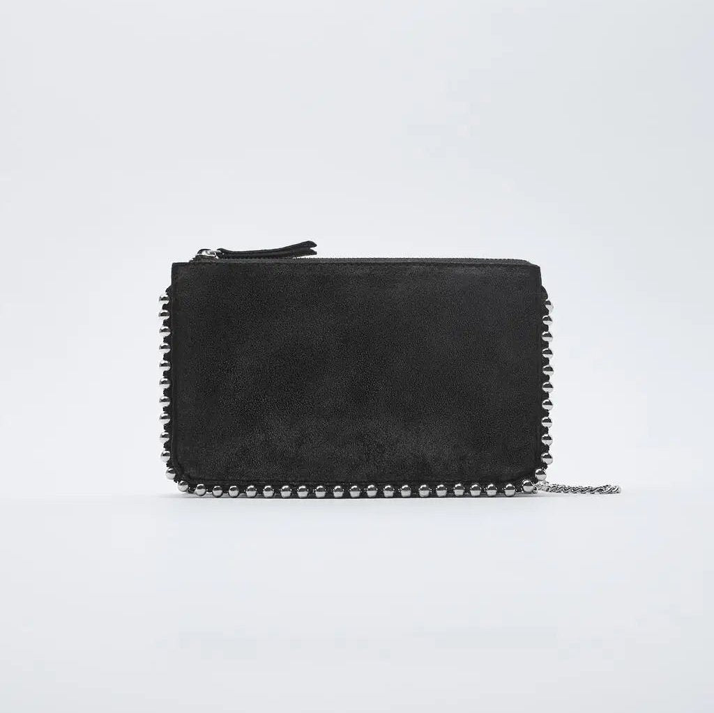 Bold yet refined, this black clutch features sleek metal studs and a detachable chain strap for versatile styling. Compact and structured, it holds your essentials with ease—perfect for evenings out or special occasions. Whether carried by hand or worn over the shoulder, it adds a touch of edge and sophistication to any look. A statement piece that’s effortlessly chic and ready when you are.