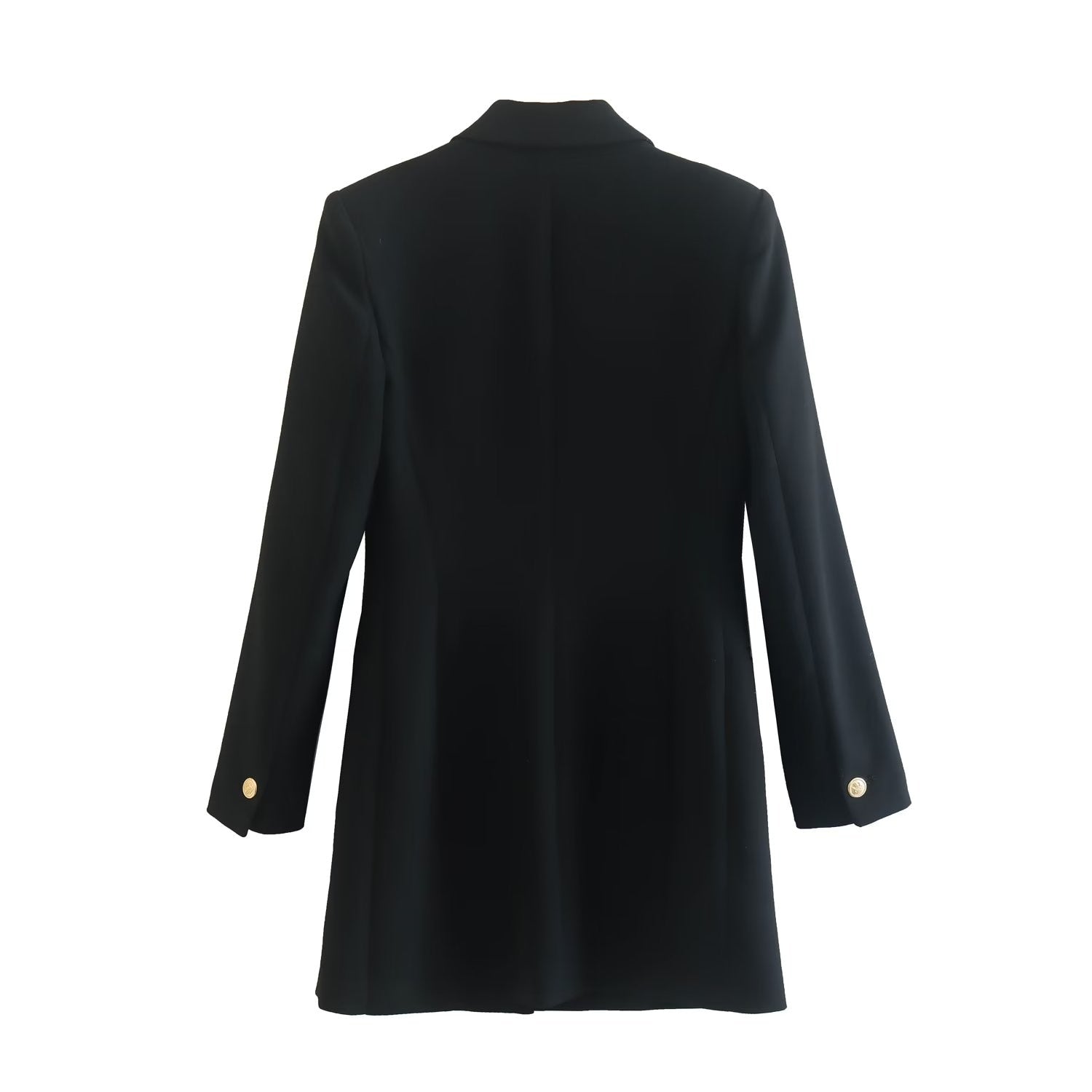 Elevate your outerwear with sharp tailoring and standout details. This longline blazer features a structured silhouette that elongates the frame and adds effortless polish to any look. Gold-toned buttons bring a refined finish, while the midweight fabric drapes cleanly without bulk. Designed for versatility, it pairs just as well with denim as it does over a sleek dress. Whether you're headed to a meeting or a dinner out, this piece delivers confidence, edge, and timeless appeal in one elegant layer. A wardrobe essential made to turn heads — without trying too hard.