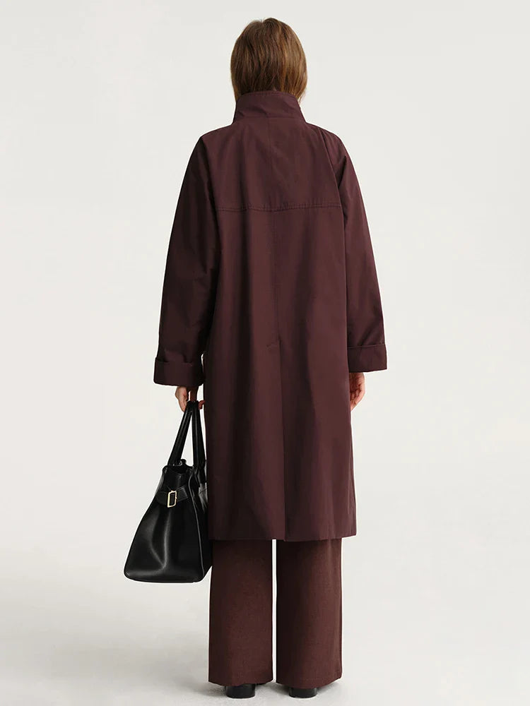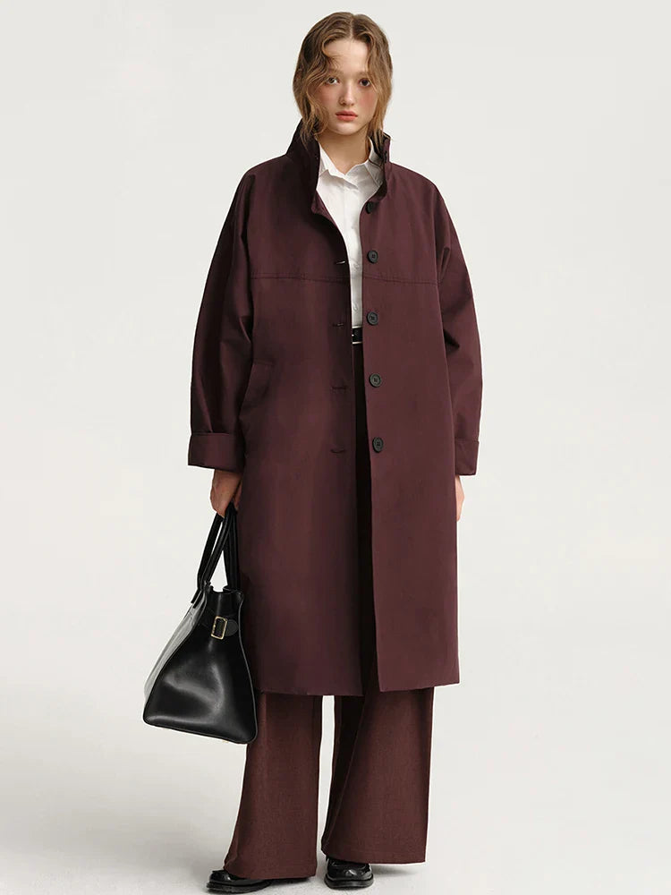 This solid trench coat blends timeless design with everyday practicality. Featuring a stand collar, long sleeves, and subtle patchwork detailing, it offers a polished look with a modern twist. Crafted from durable materials for long-lasting wear, it’s the perfect layer for crisp days when comfort and style matter most. Versatile and elegant, this coat pairs effortlessly with any outfit—an outerwear essential for every season.