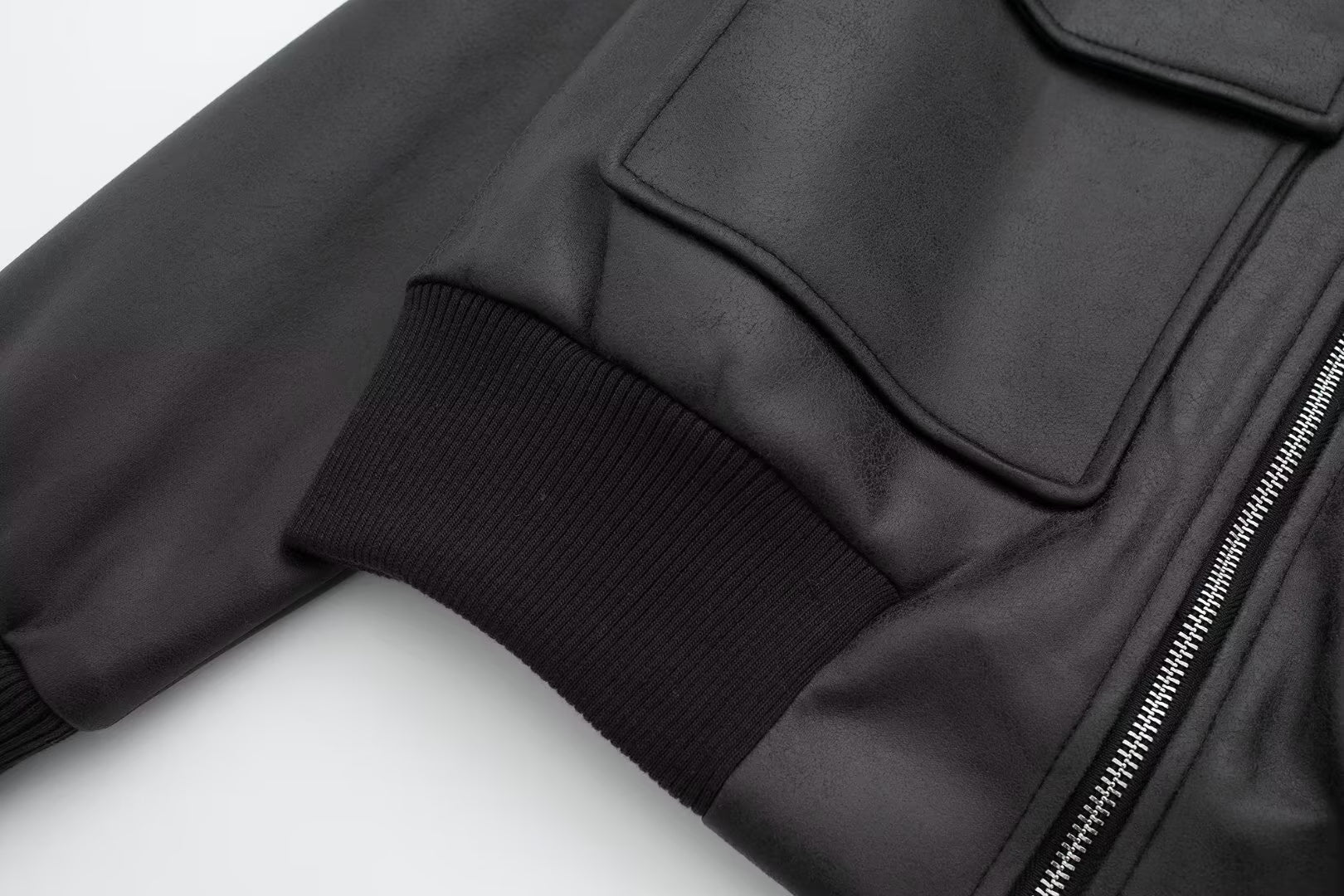 Make a bold statement with this black vegan leather bomber jacket. Designed with a zip-up front, oversized utility pockets, and ribbed cuffs, it delivers both functionality and edge. Crafted from high-quality, cruelty-free vegan leather, it's soft, durable, and sustainably made. The classic bomber silhouette flatters every body type and layers easily over tees, knits, or dresses. Whether for a weekend stroll or evening out, this timeless jacket adds instant style to any outfit. Easy to maintain and versatile for all seasons—your go-to outerwear essential for elevated everyday looks.