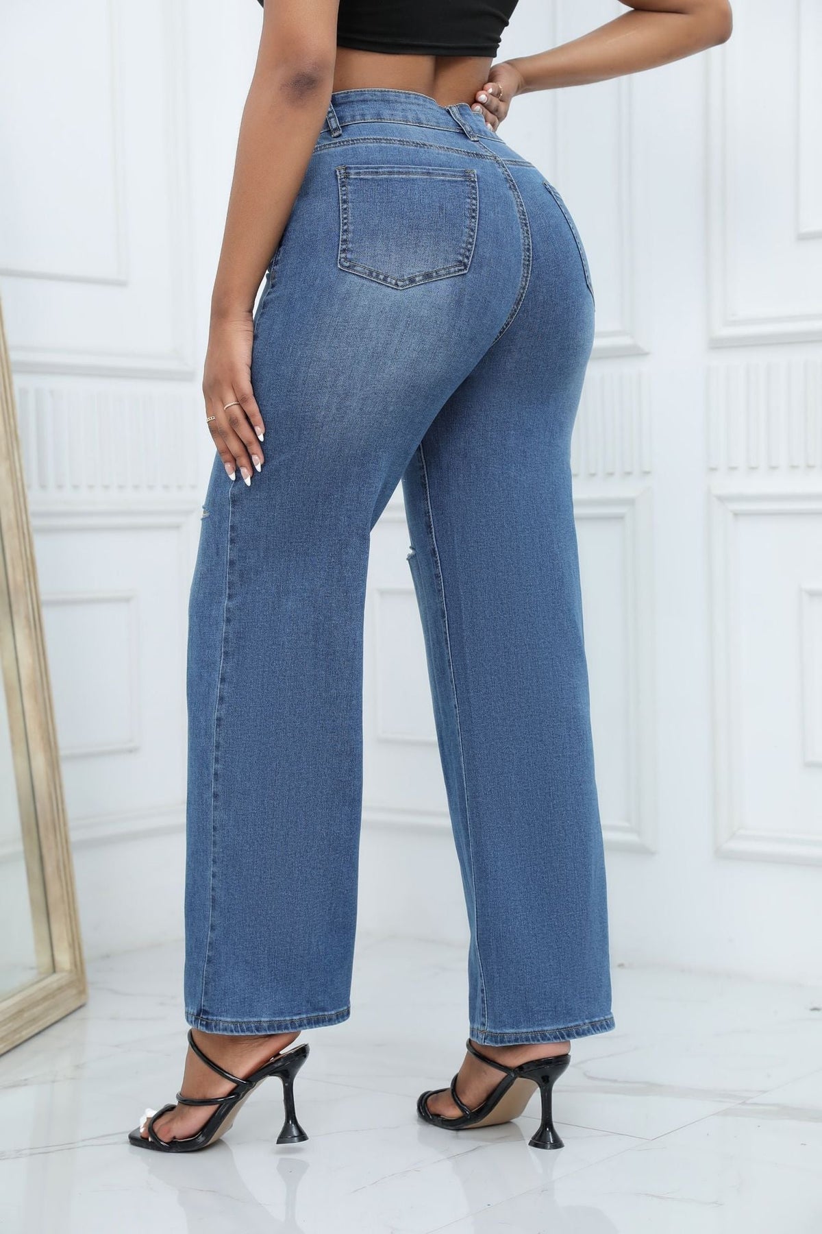 Step into effortless style with these wide-leg jeans, designed for modern comfort and edge. The flattering high-waist fit and slit knee detail offer a contemporary twist, while soft denim ensures all-day wear. A versatile wash pairs easily with any top—dress them up with heels or go casual with sneakers. Perfect for everyday chic with a bold silhouette.