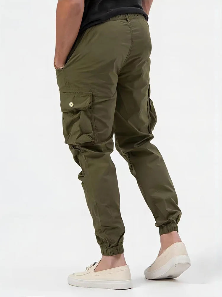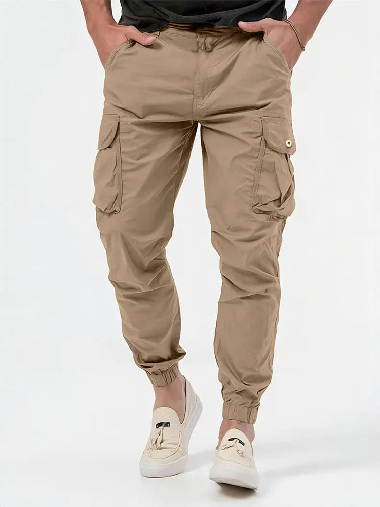 Stay comfortable and ready for anything in these solid cargo pants designed for men who value function and everyday style. Crafted from breathable, durable fabric, they feature multiple utility pockets for your essentials, plus elastic cuffs for a secure, tapered fit. Perfect for warm weather, travel, or outdoor activities, these trousers offer versatility and mobility. The modern design pairs well with sneakers or boots, making them a go-to option for casual outfits or weekend adventures. Available in multiple sizes for a personalised fit.