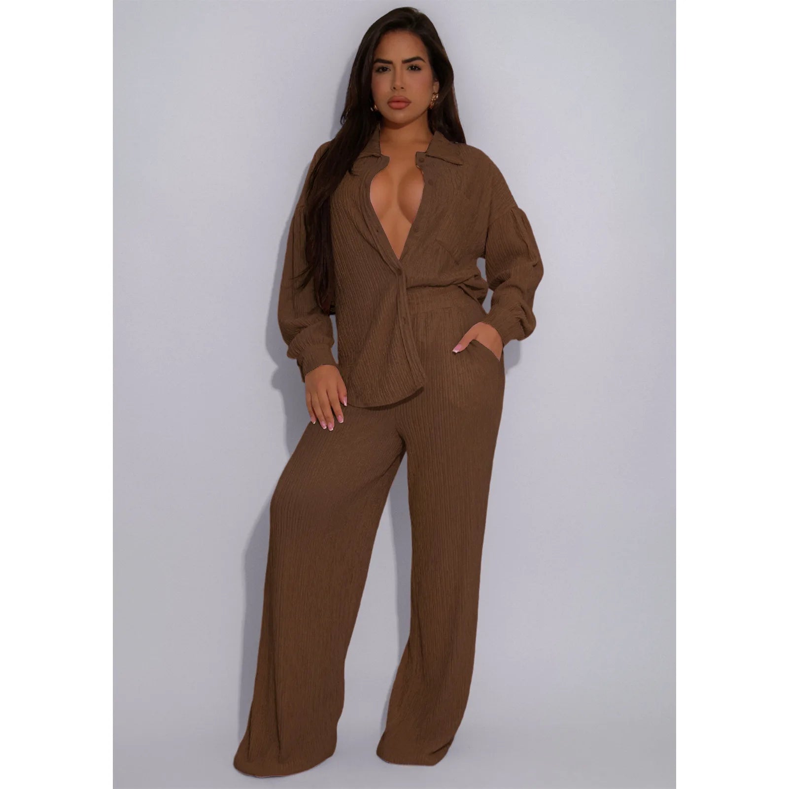 This women’s long sleeve lounge set offers effortless style and comfort. Crafted from soft, textured fabric, it features a relaxed button-up shirt with a collar and flowy wide-leg pants for a flattering drape. The elastic waistband ensures a comfortable fit, making it perfect for casual days, travel, or lounging in style. Available in versatile colours, this two-piece set combines elegance with ease, offering a chic yet relaxed outfit for both home and outings. Ideal for women who appreciate minimal, modern fashion with a comfortable edge.