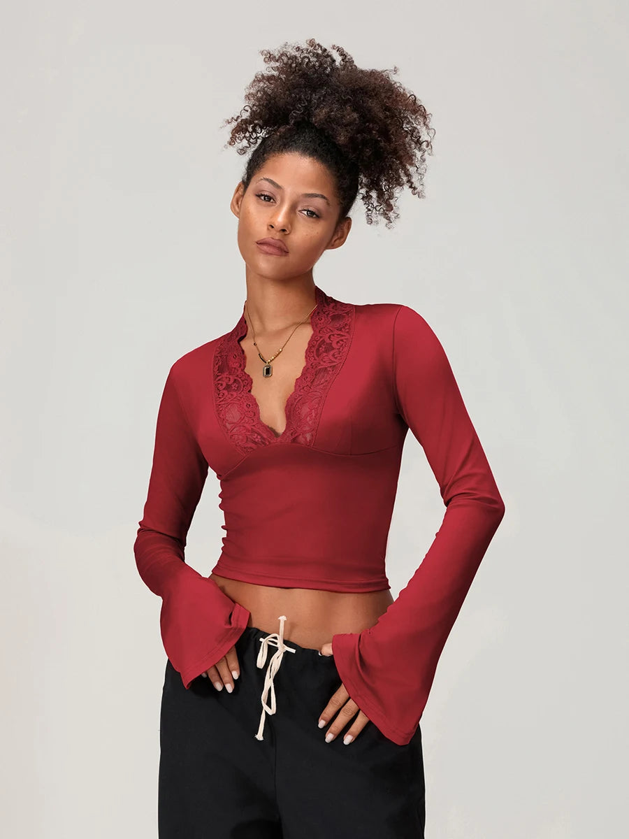ELOISE - Lace Trim Long Sleeve Crop Top